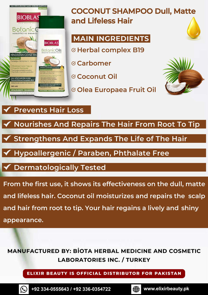 Bioblas - Coconut Shampoo  Anti Hair Loss Shampoo, also containing an organic oil, restores the appearance of your hair which has been lost over time. Prevents hair loss Nourishes and repairs...